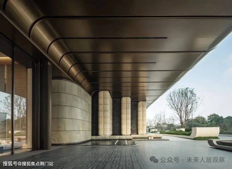 社区主入口以杭州博物馆镇馆之宝玉琮为灵感原型,将古玉琮的形制抽象转译为序列感的柱廊与台地造型;立面材质亦提取玉琮的温润色泽与肌理,以此呼应江南深厚的历史文脉与东方底蕴。