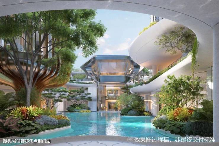 高度超16米的三层立体水院景观,搭配飞碟型景观会客厅,俯拾可见的瀑布水系、泳池,热带植物丛簇,犹如顶奢度假酒店的水院会所;