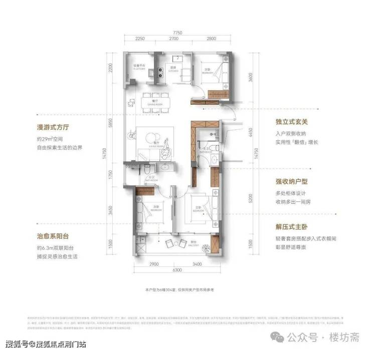户型方正,没什么浪费面积,虽然是中间套设计,但做到了全明户型,通风效果好;南向三开间,双联阳台+飘窗,南向采光充足,阳光满堂;超配S墙,隐藏收纳柜,让小家越住越大,可以说杭州少见。
