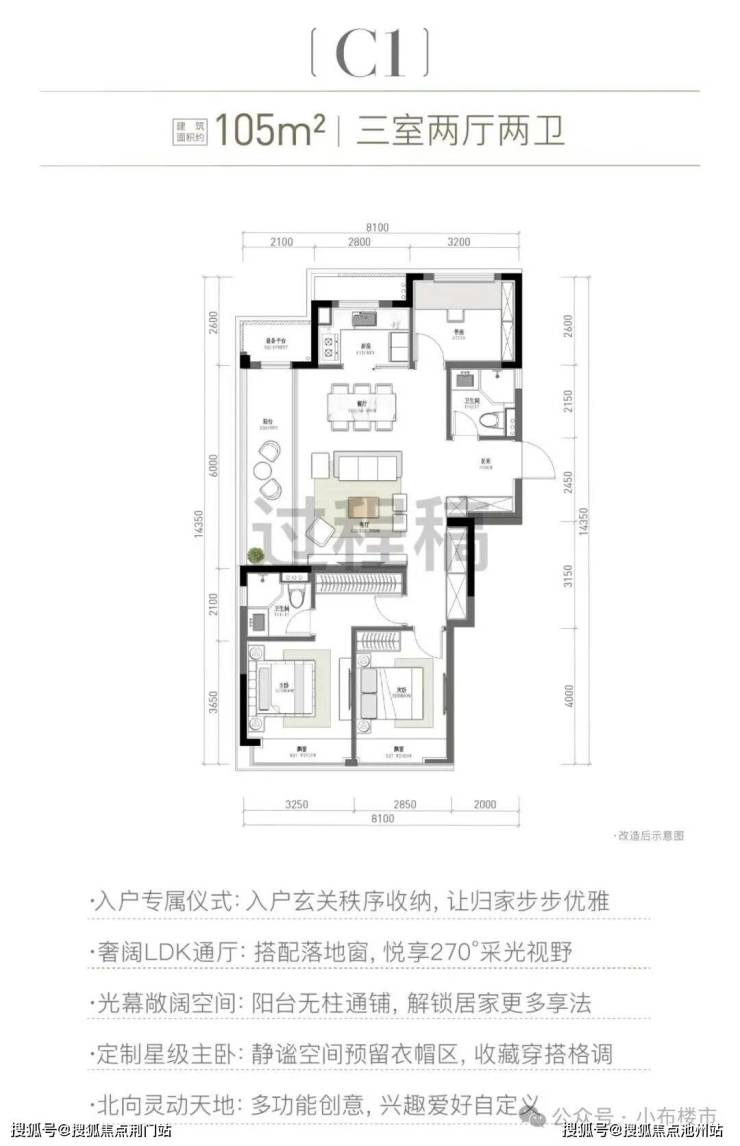 建面约105㎡三室两厅两卫,改造后实用型户型!入户设独立玄关,收纳有序 + 归家仪式感拉满;LDK 通厅搭配落地窗,270° 采光视野,空间通透感 MAX;无柱通铺阳台,采光更足、使用灵活,解锁多元居家场景;主卧打造星级静谧空间,预留衣帽区,满足收纳与穿搭需求;北向规划灵动多功能空间,可按兴趣自定义使用,整体布局合理,兼顾实用性与居住舒适度。