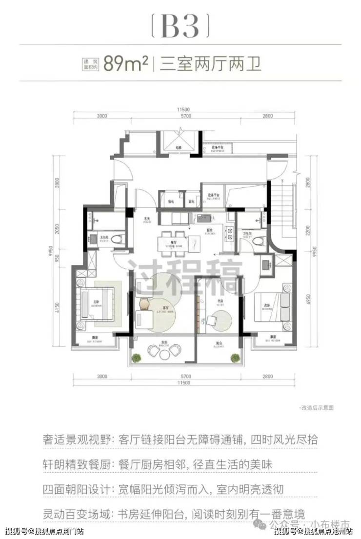 明星产品建面约89㎡三室两厅两卫,实现四开间朝南的卓越格局,南向面宽高达11.5米,搭配全景飘窗与宽景阳台,让阳光与清风满溢室内。超过90%的得房率让空间毫无局促感,LDKB一体化超能聚厅连接L型厨房,主卧套房带独立卫浴与衣帽区,兼顾实用性与尊崇感,轻松容纳三口之家的幸福时光。