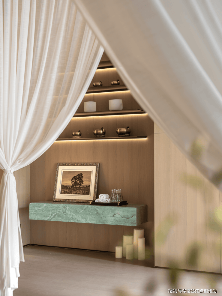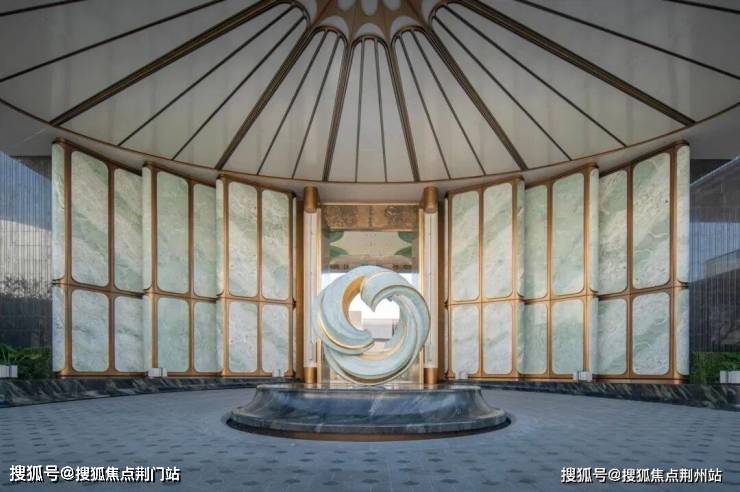 以杭州折扇为灵感而造的约56米超尺度门庭,形制舒展,寓意“藏风聚气”。12片巴西进口百达翡绿玉石屏风,温润围合。