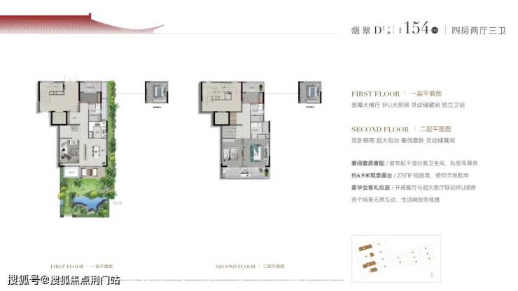 比如建面约170㎡的双层下叠四房两厅三卫,约9.7米面宽,三开间朝南的大四房格局。首层餐厅、客厅、品茶厅三个空间横向舒展,有机组合、互不干扰,单层就撑起了大平层的排场;窗外,还自带一个约9.7米宽的超大花园,满足各种野趣需求;二层是3个房间朝南,奢配约5.6米大阳台,两房联动,舒适自然。