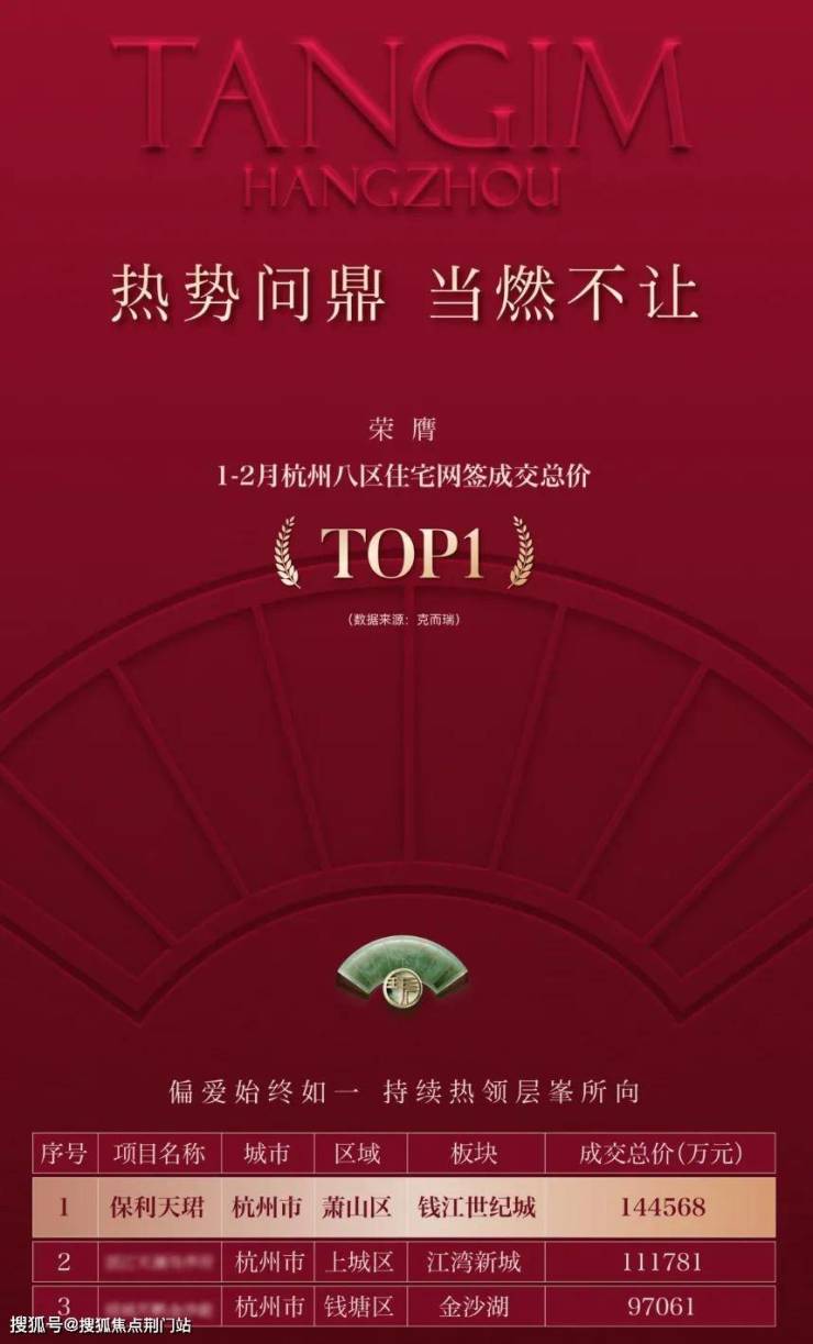 1-2月份,保利天珺是全杭网签金额TOP1(数据来源:克而瑞),至今还未看到对手,很可能在整整一季度,它都是王者!