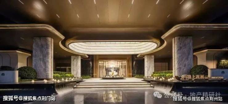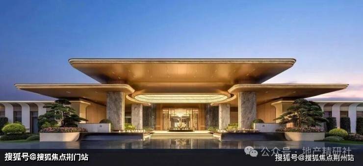 宽约78.8米、高约9.2米的大门,奥映鸣翠同款的梵高白石材,温润大气,与古铜色铝板的搭配,透出古典的韵味又不失轻盈。传统建筑穹顶元素也进行了现代化演绎,到了晚上灯光亮起,就变成了金碧辉煌的藻井。