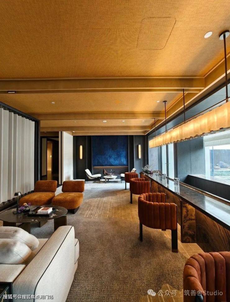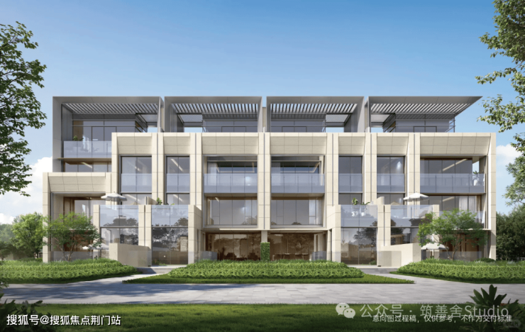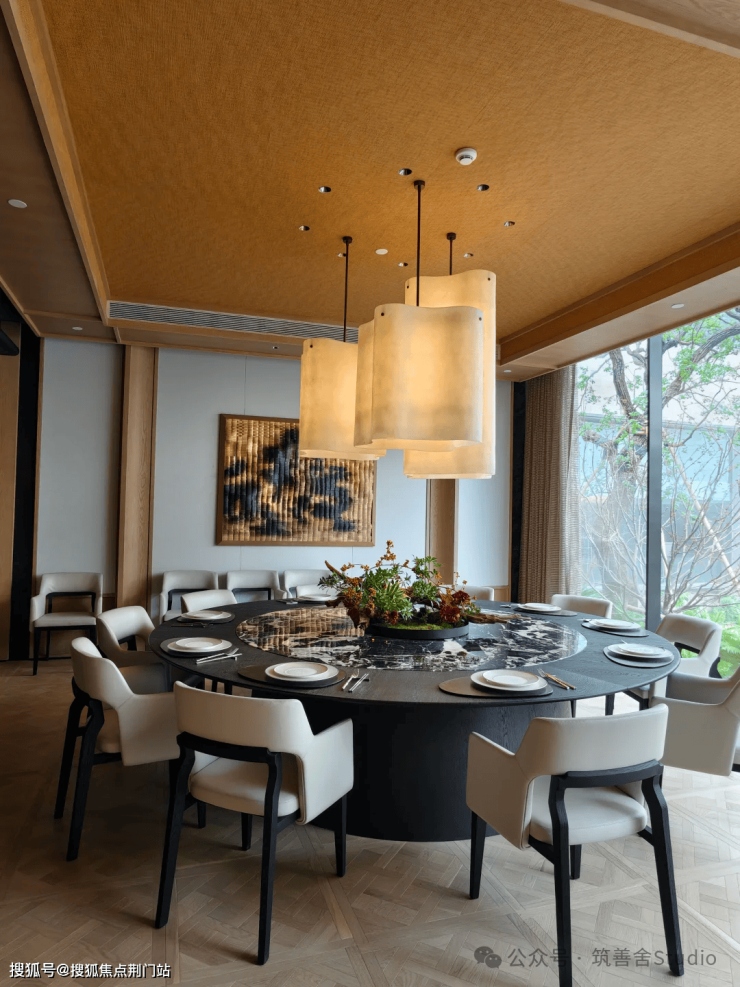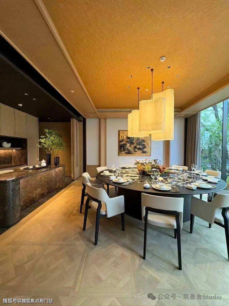 安璞的建筑立面,同样以其卓越的审美理念惊艳亮相,高层外立面以中式对称美学为基底,横向延展的铝材线条与大面积玻璃,赋予楼宇轻盈飘逸的视觉感受,实则坚固稳固,彰显空间容量而非体积感。南立面尤为惊艳,石材的厚重、玻璃的通透、均釉陶砖的温润,三种材质刚柔并济,在0.618黄金比例的精准统摄下,交织出极具艺术张力的奢华气韵。铝板、陶砖与石材的精妙结合,不仅保留了现代线条的轻盈,更通过陶材的温润光泽和石材的沉稳质感,营造出富有层次的艺术魅力。