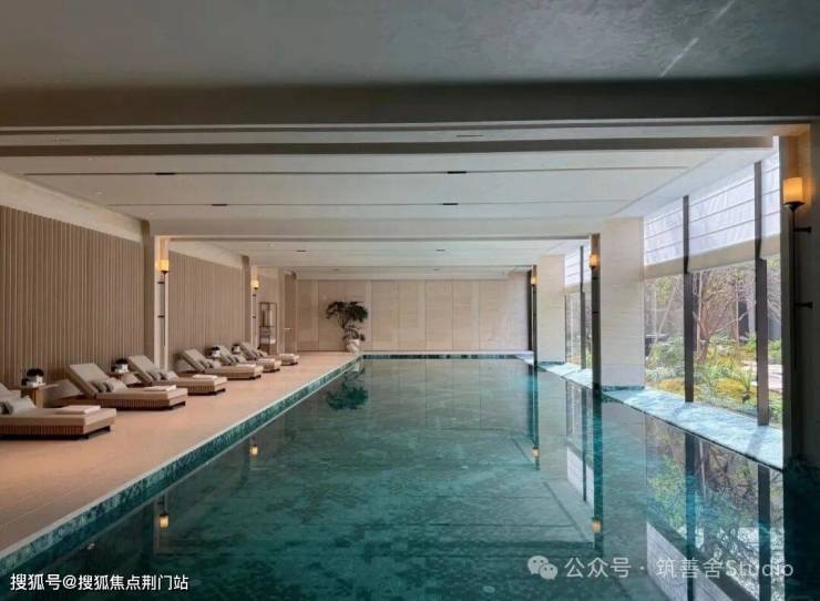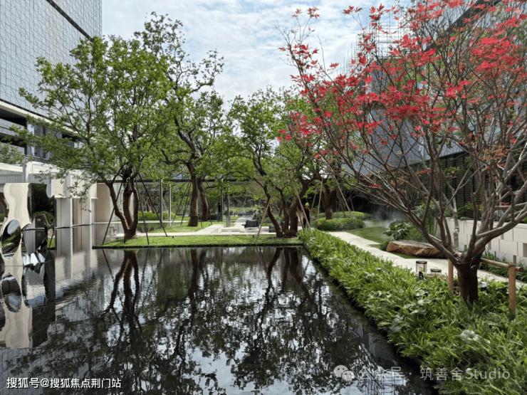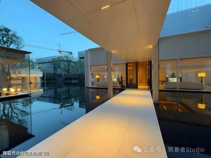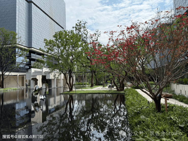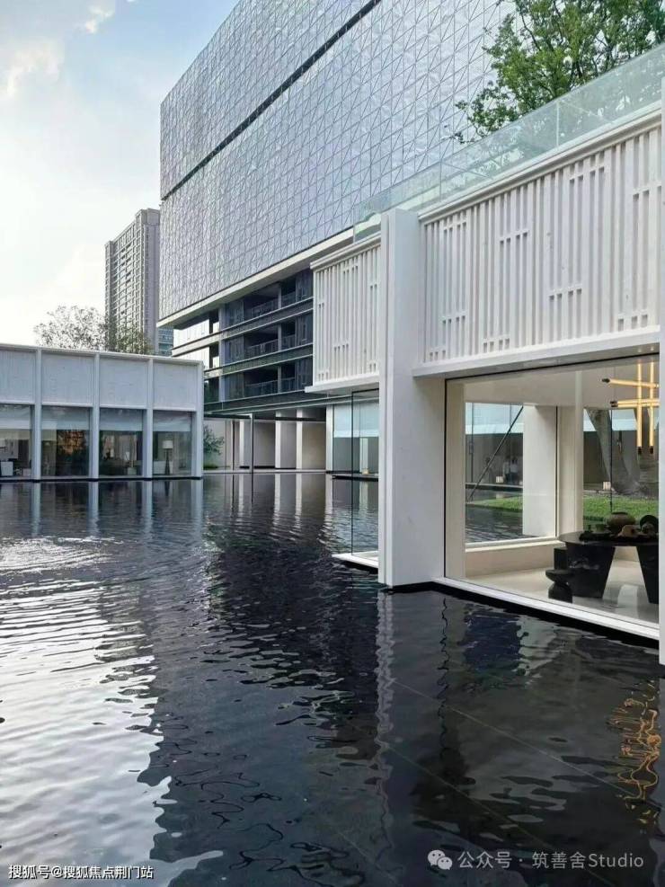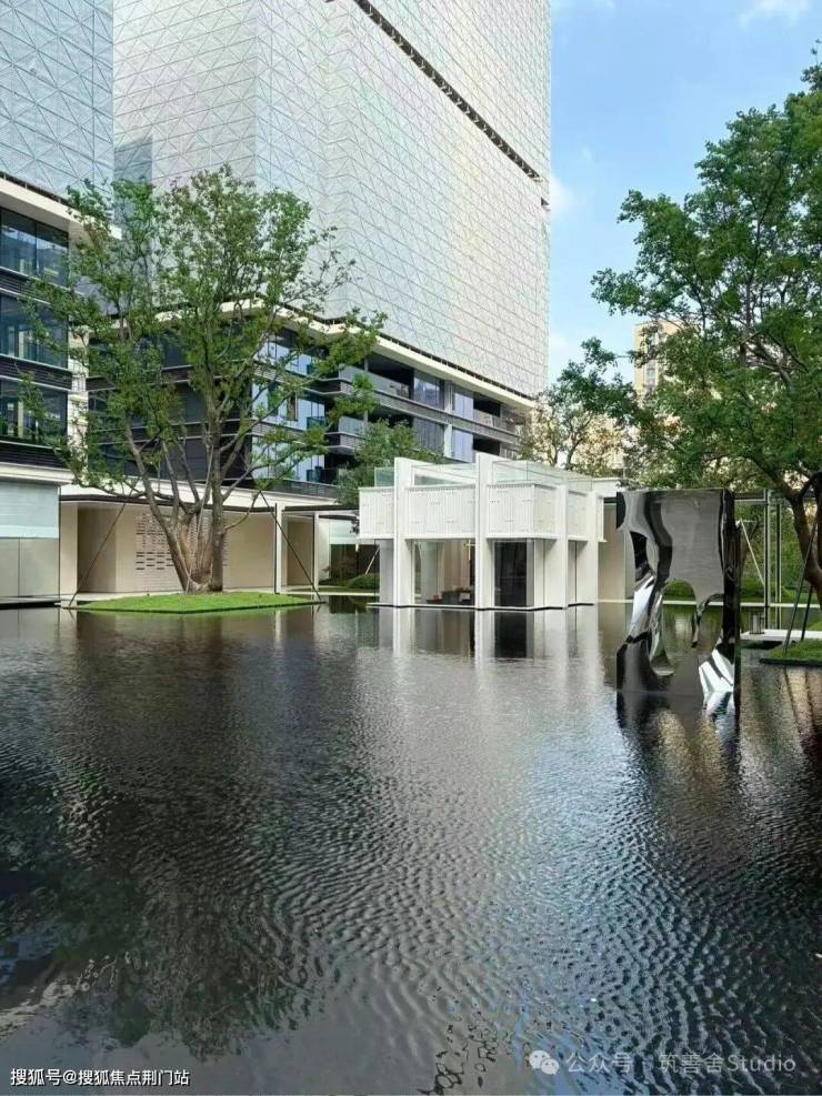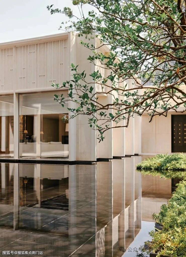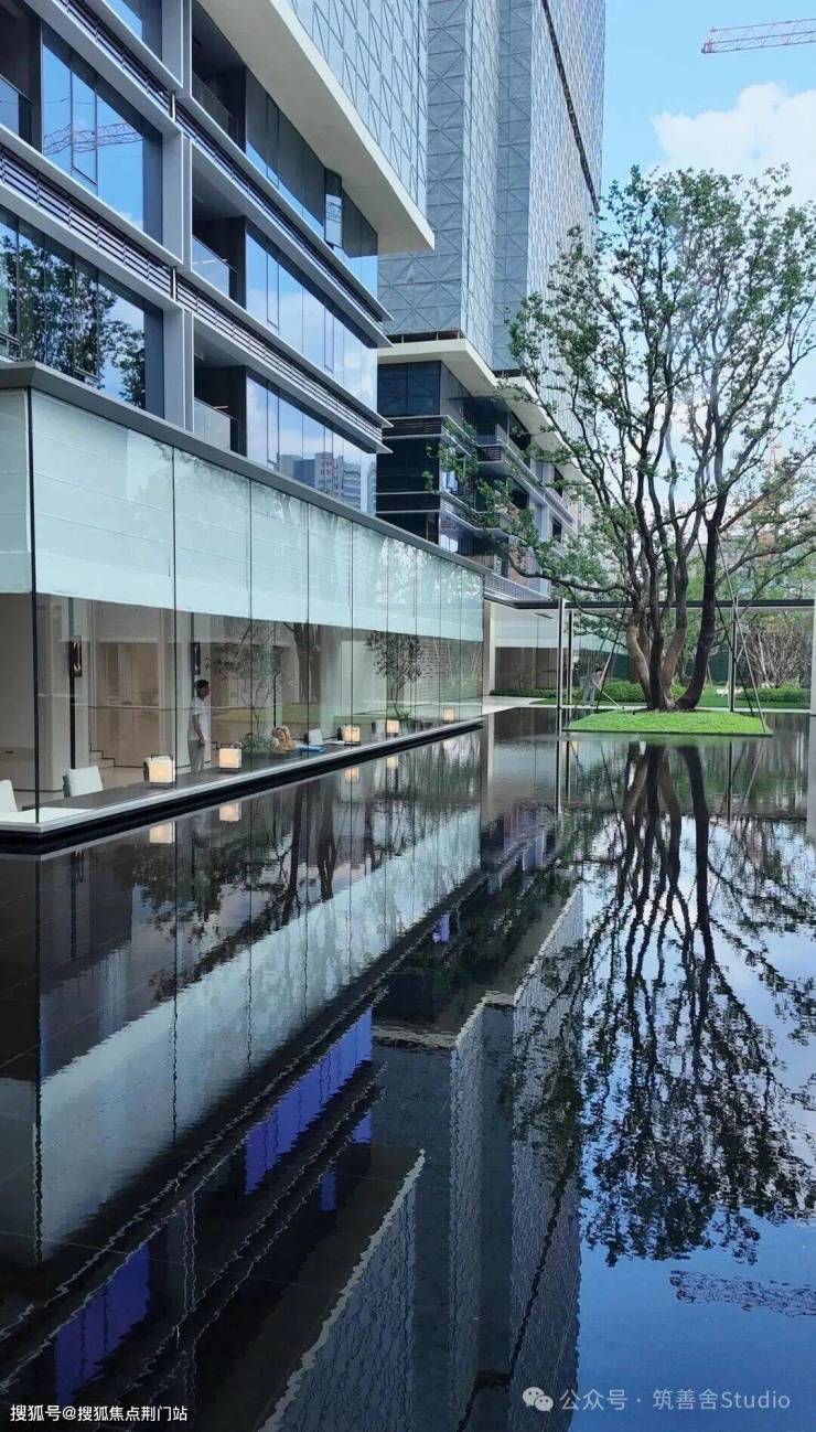 园林设计上则更偏酒店化,以希腊安缦卓熠为灵感,整个核心区园区以约900方的无界中央水景为主体。穿过大门后,约900㎡的无边界水景豁然眼前,建筑、回廊与树丛仿佛凌波而立。正如“美人在骨不在皮”,无需繁复修饰,大尺度空间、开阔水院与大面积玻璃自成画布,任自然光挥洒,这才是内蕴的性感。最是没的是在11号楼架空层的邻里中心——窗沿与水院浑然一体,桌案几乎与水面持平,微风拂过,涟漪便从眼前漾开。庭院里的丛生乌桕,不事雕琢,保留原生枝条的疏朗与错落,尽显自然之美。