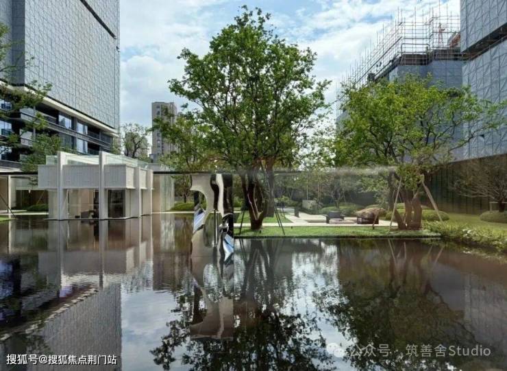 深植传统园林智慧,安璞构建起“行、望、居、游”景观体系。以核芯水院聚合庭、院、林、屿、亭、泉六重诗意场景;围合布局中心庭园,将远处林冠、近处波光引入室内,实现户户有景,窗窗成画的景观平权。