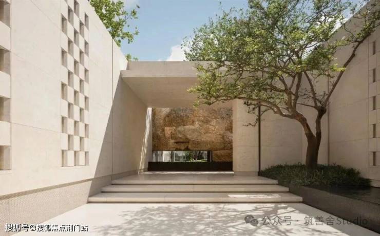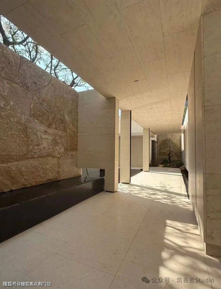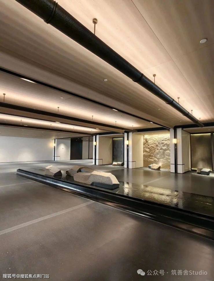 约36米长的主入口,与这其他项目流行的巍峨豪阔、金碧辉煌已截然不同,黑白原石的碰撞,没有五颜六色的炫石,主打一个高级黑白灰,从社区主入口便能领略这份高级感。它并未将大门设在主干道,而是巧妙地选择在西侧次路,营造出一种归隐都市的谧静氛围。以维纳多石材为主体的双门设计,左侧是人行入口,右侧为车行入口,秩序井然,人行车行各司其侧,搭配古朴铜门,尽显宏伟与艺术格调。太行金老石皮打造的景墙,借框景手法呈现流水山石的空灵意境。