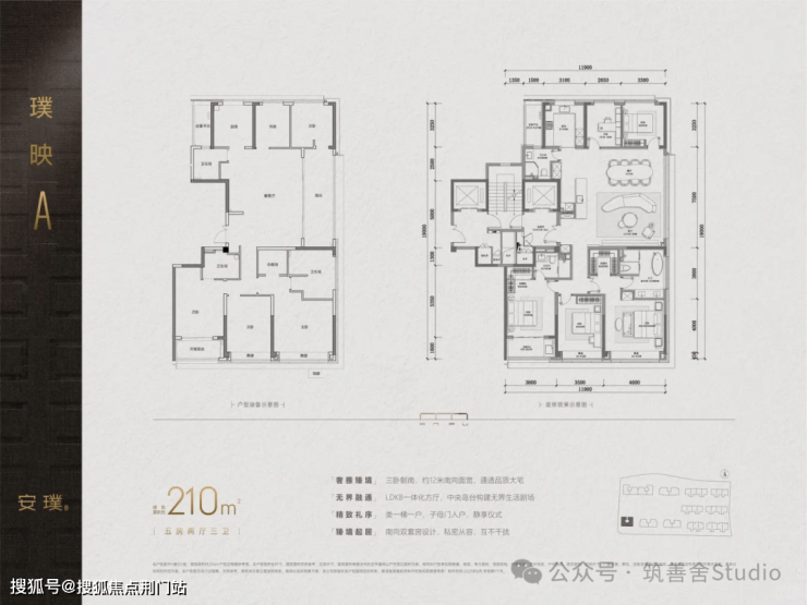 210㎡户型为5房双套房设计,三面采光保障室内通透,适配三代同堂的基础居住需求,家庭成员各享独立空间,互不干扰。