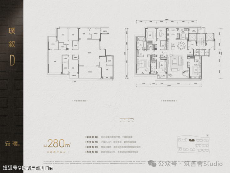 280㎡户型配置6房三套房及保姆间套房,20米面宽带来开阔视野,超30㎡主卧套房兼具私密与尊崇,尊贵感尽显!