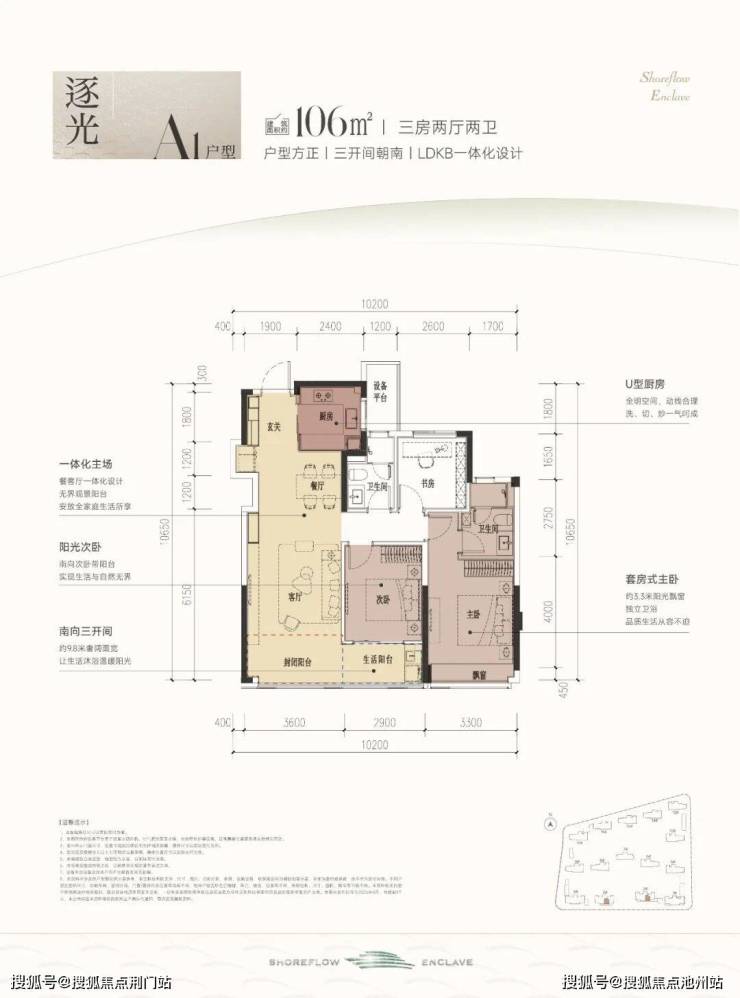 建筑面积约106㎡A1户型,户型方正,三开间朝南+LDKB一体化设计,基本没什么浪费面积。虽然是中间套设计,但做到了全明户型,通风效果好,可以说杭州少见。
