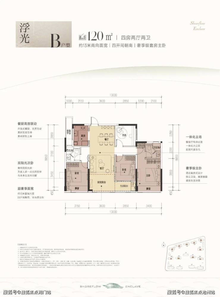 建筑面积约120㎡B户型,采用了四开间朝南的排布方式,总面宽约13米。三个卧室和餐客厅均朝南,让每一个空间都拥有南向阳光平权。餐客厅和次卧连接了一个双联大阳台,双飘窗,赠送面积多。而且客卫就在次卧边上,生活起居也是便捷不少。