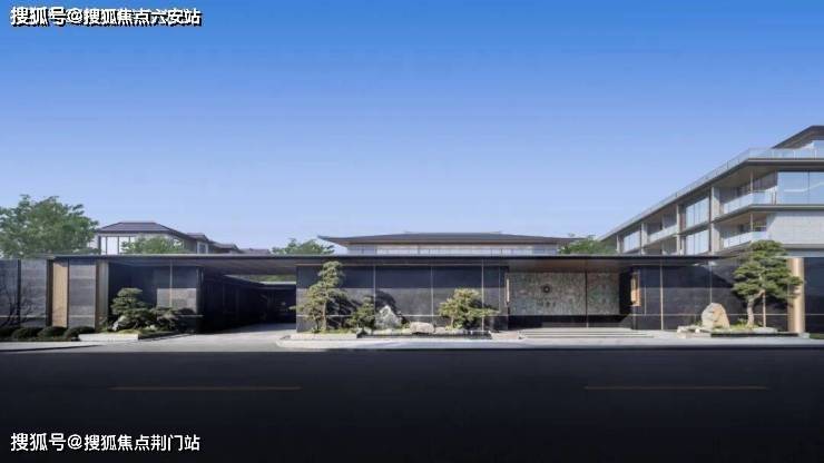 园林设计以中央山水景观轴为骨架,构建“一轴一带八景十巷”的多进式体验。入口处50米跨度大门以亚马逊黑奢石打造墙面,对景墙以亚马逊绿奢石镶嵌金石,刻绘项目Logo与六瓣梅花图腾,彰显沉静尊贵气质。