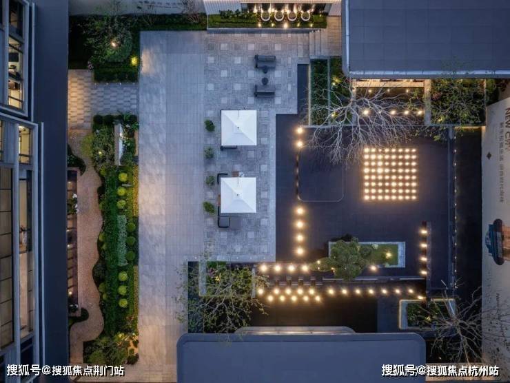入口两侧油橄榄树姿态优雅,自带松弛感;归家序厅两侧有种植桂花树,隐喻"蟾宫折桂"的祝福;地面铺装芝麻黑花岗岩与福鼎黑花岗岩,不仅沉稳大气还有活泼灵动……