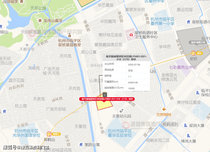 7月8日上午,位于临平区星桥板块LP0801-R21-41B(C70)地块经过6轮竞价,地块由台州市中德天诚房地产有限公司竞得,成交楼面价11007元/㎡,溢价率10.07%。