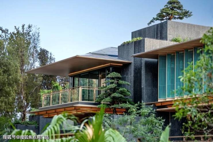 场地结合原始地形,因山就势,最终呈现出以“湖山设计空间”的创造。设计从宋代建筑中提取歇山顶样式,转译形成深远的挑檐,在视觉效果上给人以棱角分明、结构清晰之感,整体呈现一种清雅内敛的当代气质。融汇“合院形制+叠墅露台”等全新形态,全新打造轻宋式合院。