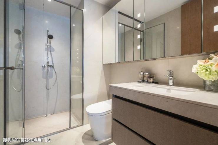 卫生间镜柜内嵌插座,一次性解决吹风机、卷发棒等长期“连线”需求。柜门后设有隐形层架,实现 “用品视野化”。每户主卧还标配美妆冰箱,精华、面膜、眼霜与食材彻底分离。