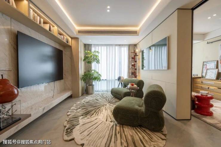 客厅的背景墙四周,不仅嵌满一面面吊柜和储物格,展示柜还装上灯带和玻璃门。你收藏的各种隐藏款Labubu,这里就是最好的舞台。春来晴翠园称之为“情绪收纳”。