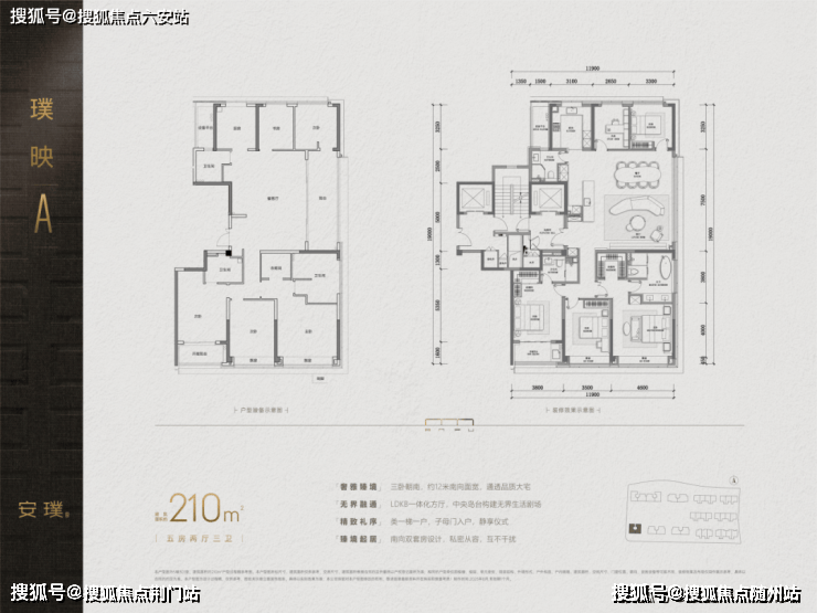 在户型设计上,安璞同样表现出众。约210㎡户型为五房三卫,其余户型均配备四卫,并实现三间套房布局,极大提升了居住的私密性与舒适度。