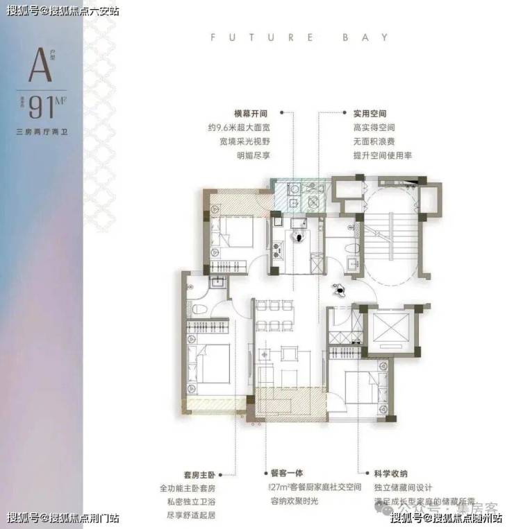 建面约91方真三房户型,真南北通透洋房产品北侧无消防连廊设计,小面积也是真南北通透,区别市面2+ 1户型,最小的卧室也有将近9个平方,每个卧室面宽均达到3米及以上