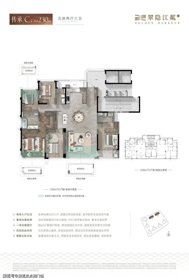 建面约185平户型,打造四房双套房三卫;建面约230平户型,则是做了市中心难得的五房双套房三卫设计。
