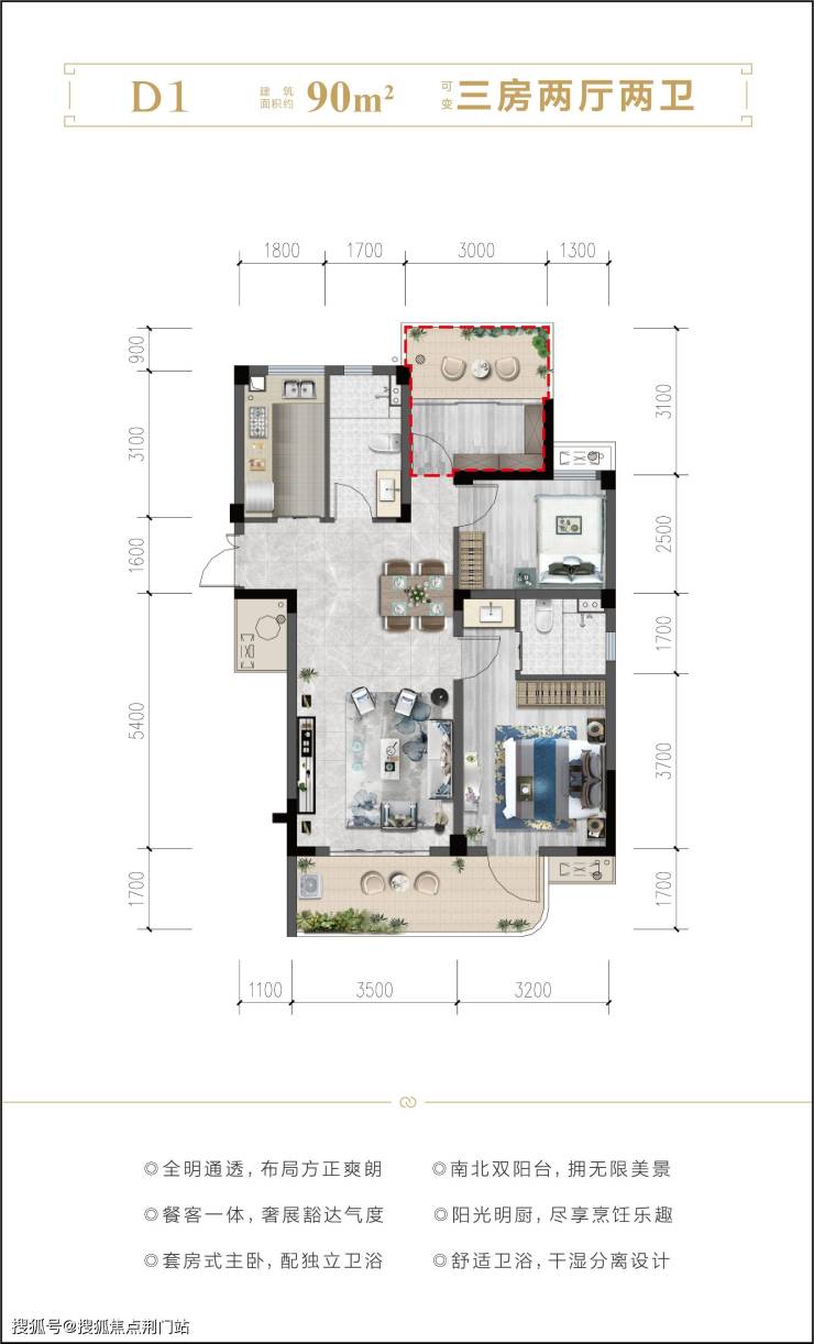 户型细节:瞰景阳台的转角皆优化为圆弧形设计,不仅体现了柔和的美感、也进一步提升了产品独特品质感。