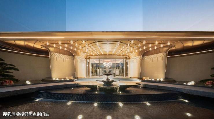 建筑立面采用香槟金铝板配合大面玻璃,细部使用美国灰麻石材,辅以精致金属线条,钢琴漆工艺波浪铝板,一看就很贵气,很有辨识度。