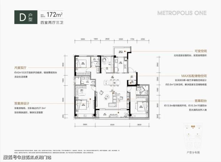 约172平方米的户型体现了生活的极致表达,其配备宽敞的大厅和跑道式阳台,四开间朝南和双套房的豪华设置使其在同类户型中突出。特别是厨房靠近客厅一侧的餐厅布局,使厨房成为家庭生活和社交的中心。