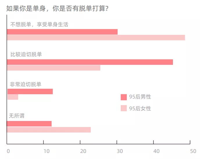在贝壳研究院的数据统计中,我们能看到,将近有50%的95后女生“不想脱单,享受单身生活”