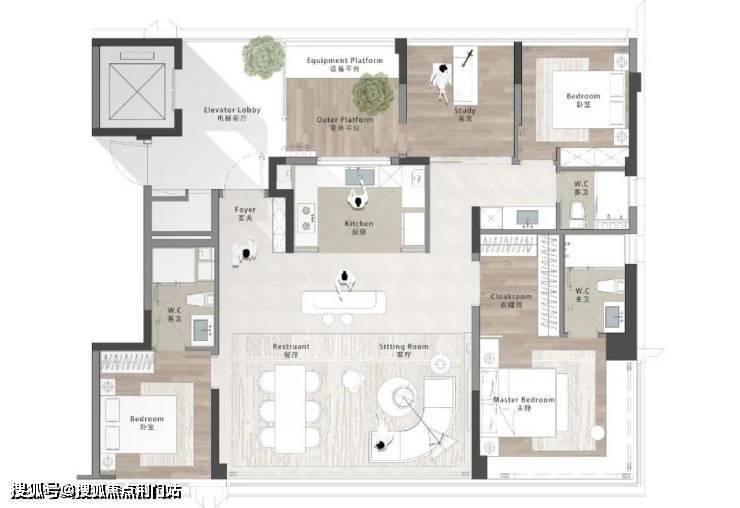 在客餐厅、中岛形成的小洄游空间之外,还可以连接北侧的书房、北阳台、私家电梯厅,形成一个可以植入更多生活场景的大洄游动线空间。