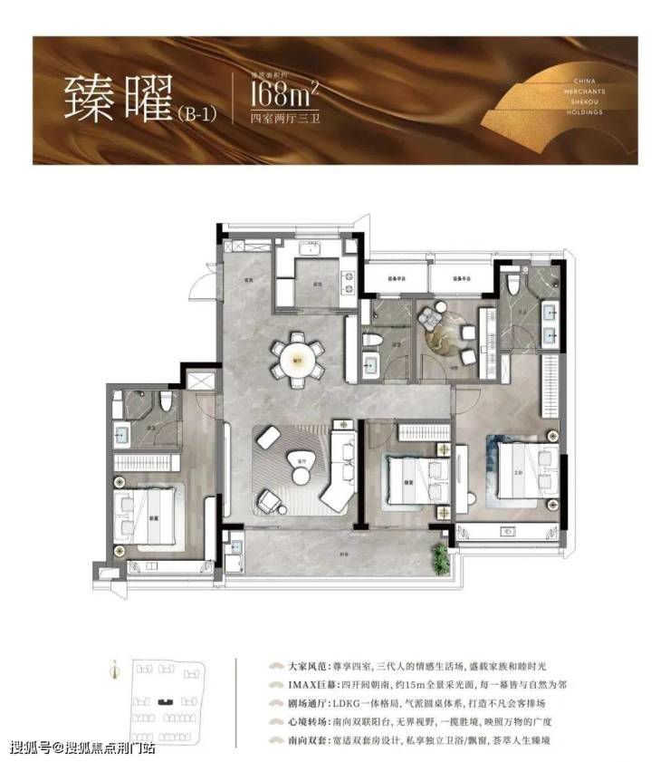 以中间套为例,建面约123㎡的户型做到了主次卧+客厅四开间朝南,伸展开约13.3米的超大面宽,对应双开间阳台与飘窗的设计,进一步提升了全屋的采光。此外,一体化的餐客厅,“一镜到底”活动空间,在视觉上拉大了户型的朗阔尺度。