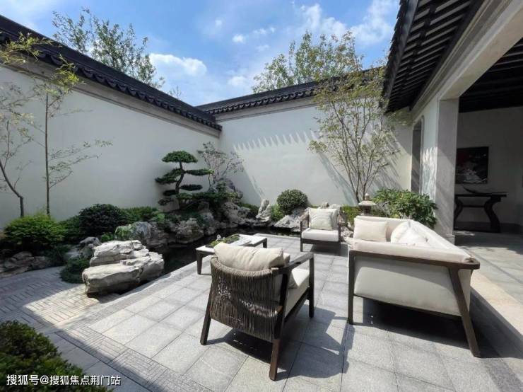 江南园林甲天下,苏州园林甲江南,比如像我们现在看到的园林布局,就是经典的苏州园林景观,讲究引水入园。造景围绕着这片水景展开,空间上比较有层次感。近景是流水、堆石,中景是连廊、假山,远景是中式合院的院墙、屋檐。