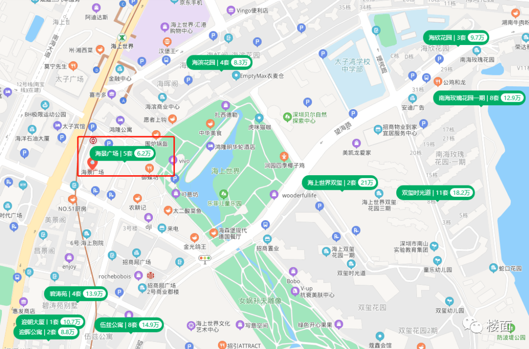依旧以深圳为例,很多小区都存在这种情况,比如南山的海景广场,一个集办公、商住、餐饮于一身的综合性楼宇,居住在这里生活便利度很高,且紧邻观光景区海上世界,但在区域均价12.6万的蛇口片区,它6.2万的均价俨然成为了拖后腿的存在。