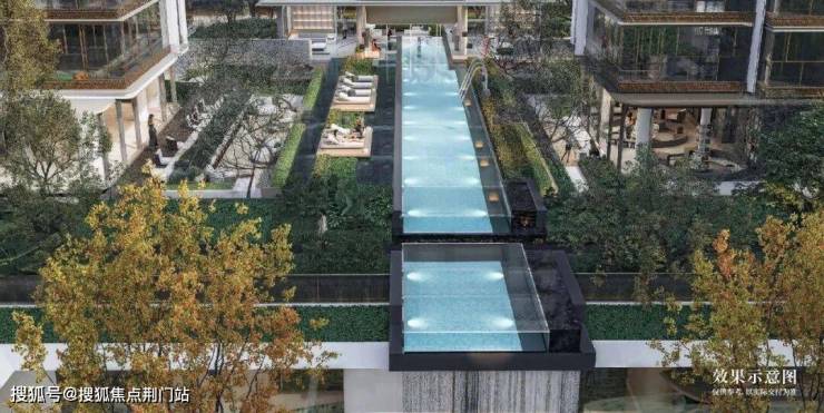 1200平米下沉式庭院,叠水成瀑,打破常规“坑洞”设计,打造上下双层平行空间,营造独特的滨水度假体验,令人一见倾心。