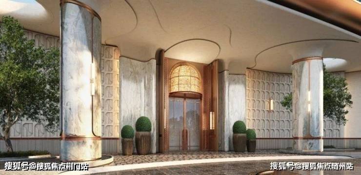 潮映杭园不惜重资打造千万级高奢门厅,汲取上海前滩华尔道夫酒店的设计灵感,大气展开约46米超长界面、约9米挑高巨幅门头。