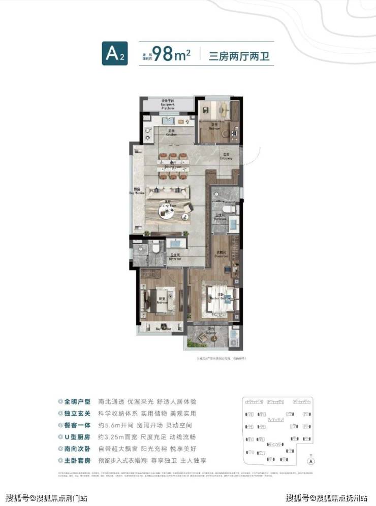 中建·潮阅尚境府总户数1689户,户型面积段分为建面约98方、105方、125方、135方、139方五种,其中主力户型为98方的三房两厅两卫的中间套和边套,合计逾千套。98方三房两厅两卫边套户型,是市面上稀缺的边套小户型,但相对很多其他项目,中建·潮阅尚境府在户型细节上,做到了更舒适。
