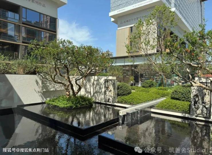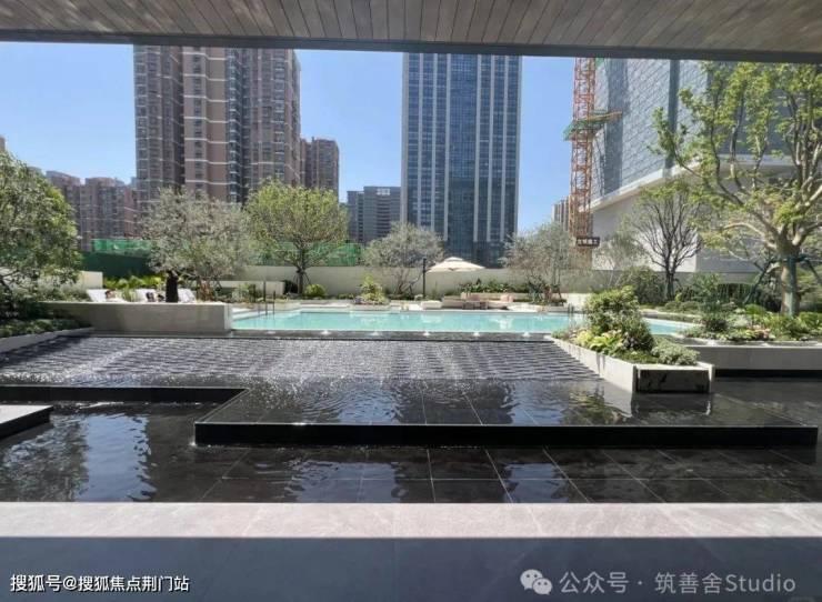步入此境,眼前即刻展开的是一幅精致的景观水系画卷。流水潺潺,与周围的翠绿植被交相辉映,勾勒出一幅生机勃勃的画面。循水而行,连廊曲折迂回,既为业主提供了避风躲雨的便捷,又营造出一种充满仪式感的回家之路。