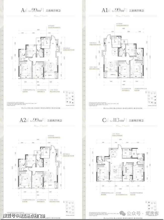户型设计:建面约99㎡的三房两卫户型,动静分区,采用三开间朝南设计。建面约113㎡的三房两厅两卫户型,四开间朝南,拥有封闭式阳台,南向采光充足,使得整体空间更加宽敞明亮。