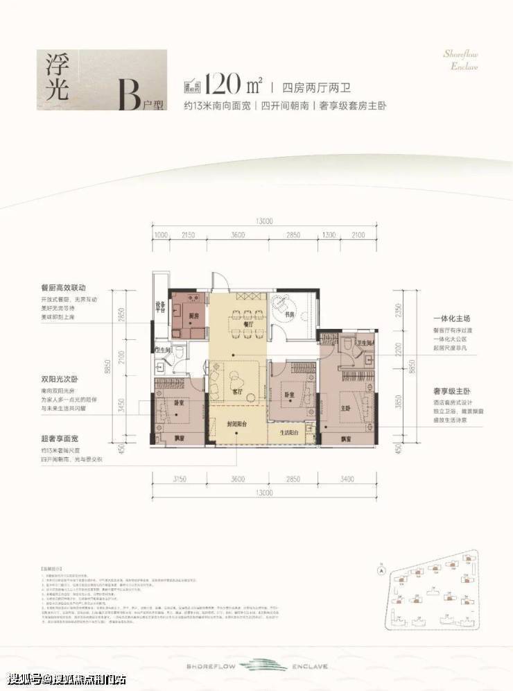 建筑面积约120㎡B户型,采用了四开间朝南的排布方式,总面宽约13米。三个卧室和餐客厅均朝南,让每一个空间都拥有南向阳光平权。餐客厅和次卧连接了一个双联大阳台,双飘窗,赠送面积多。而且客卫就在次卧边上,生活起居也是便捷不少。
