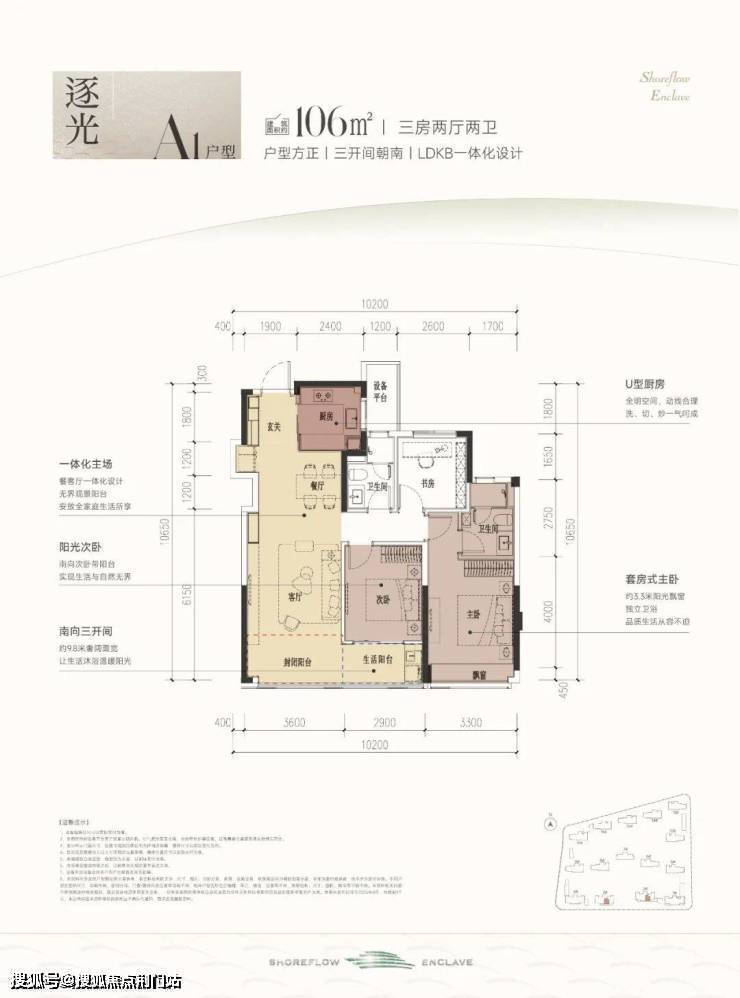 建筑面积约106㎡A1户型,户型方正,三开间朝南+LDKB一体化设计,基本没什么浪费面积。虽然是中间套设计,但做到了全明户型,通风效果好,可以说杭州少见。