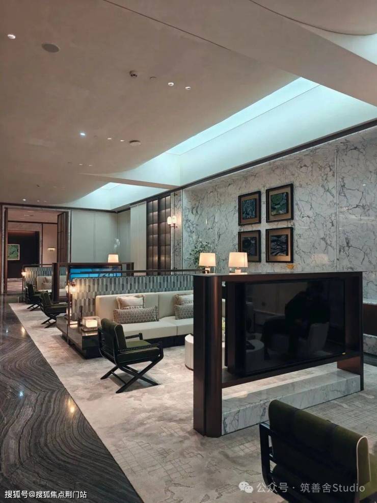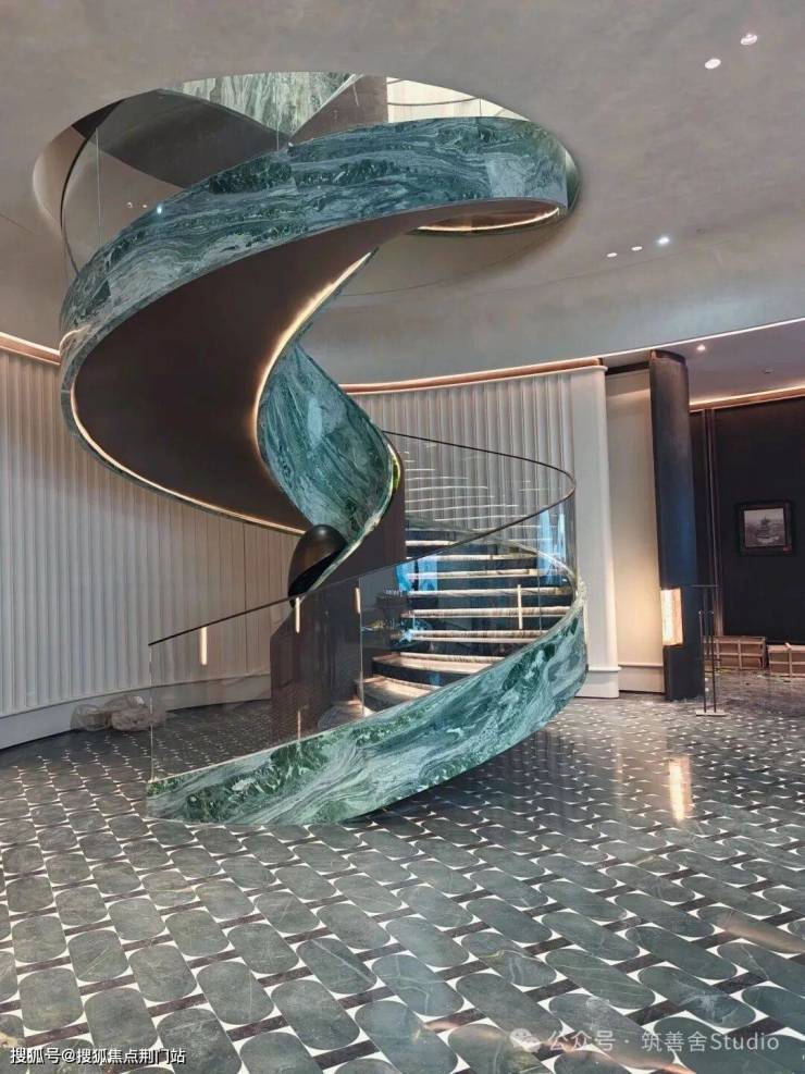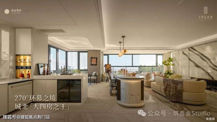 宽约60米的宏伟大门,精选铂金钻、芬迪白、维多利亚绿、安哥拉黑等珍稀石材,通过干挂、弧角等精湛工艺,巧妙堆叠而成。搭配深色与香槟色的弧形铝板“鎏金华盖”,成为城北人居的标志性门面,尽显归家时的第一重尊贵礼遇。