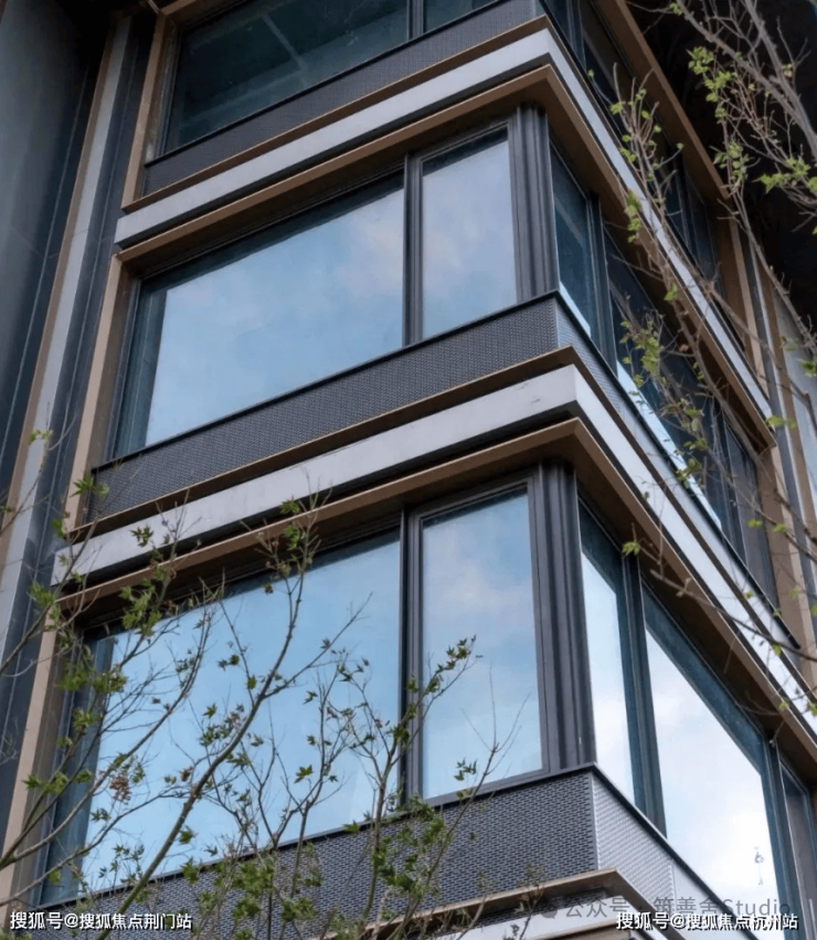 项目建筑宥九米建筑设计院设计,其立面设计沿袭锦庐系经典公建风貌,精选四面铝板与广阔玻璃相结合,打造出封装阳台的精致与通透明快感。底层选用浅色调天然石材,巧妙融入圆弧设计元素,彰显出空间的优雅与品味。这种极致细腻的金丝画框设计,四边以高品质金属铝板环绕,搭配全景玻璃幕墙,既彰显通透之美,又体现现代风格,香槟金与深灰的优雅搭配,令整体外观更显高贵气质,颜值是很不错的。