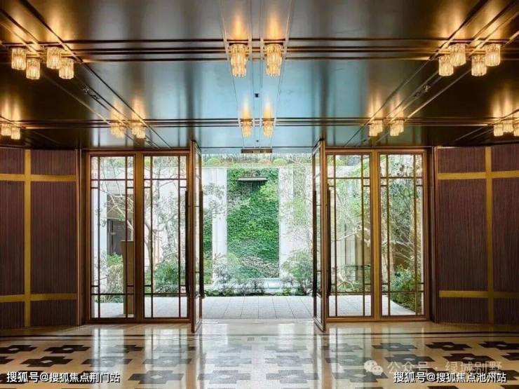 玉树门庭,传承芝澜月华的优雅入口,墙面采用贝金米黄石材,高达7米的玉树构架以UHPC材质精心打造,柱身巧妙嵌入蓝翡翠玉石与亚马逊绿奢石,尽显奢华与精致。