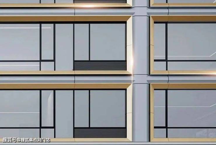 但住宅不是公建,在江映云邸的立面打造上,经过设计的无数次推敲打磨,加入了迷人的几何线条——约2CM的精致框线窄边,以金、银两种铝板的方式,镶嵌在立面之上,组成双眼皮窗框,内嵌45°斜切棱镜,这样打磨而成的「金丝镜框」,如同一件流畅的艺术品。