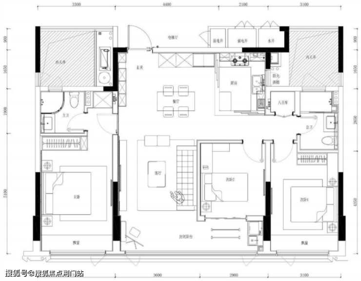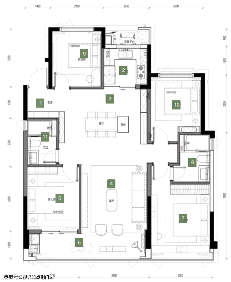113方是这两年非常流行四开间南布局,“3卧+客厅”均朝南,这种户型设计一般只会出现在139方以上户型。