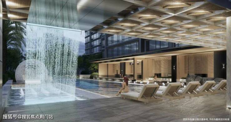 二进踏浪迎宾,如果你在三亚或曼谷度假,你下楼去泳池边上的时候,会想要有什么,所以我们就做了目前杭州难得一见的飞瀑度假池,还通过瀑布做出了一个分池。