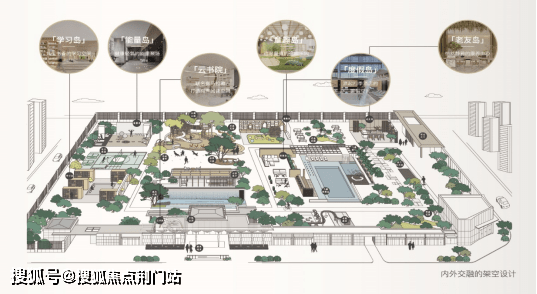 6座「庭院会所」:江映云邸赋予每一个架空层空间不同的功能主题,打造云书院、度假岛、读书岛、能量岛、童趣岛、老友岛,同时把架空层与庭院进行融合设计,让主题化架空层,拥有一个相对独立的专属花园。