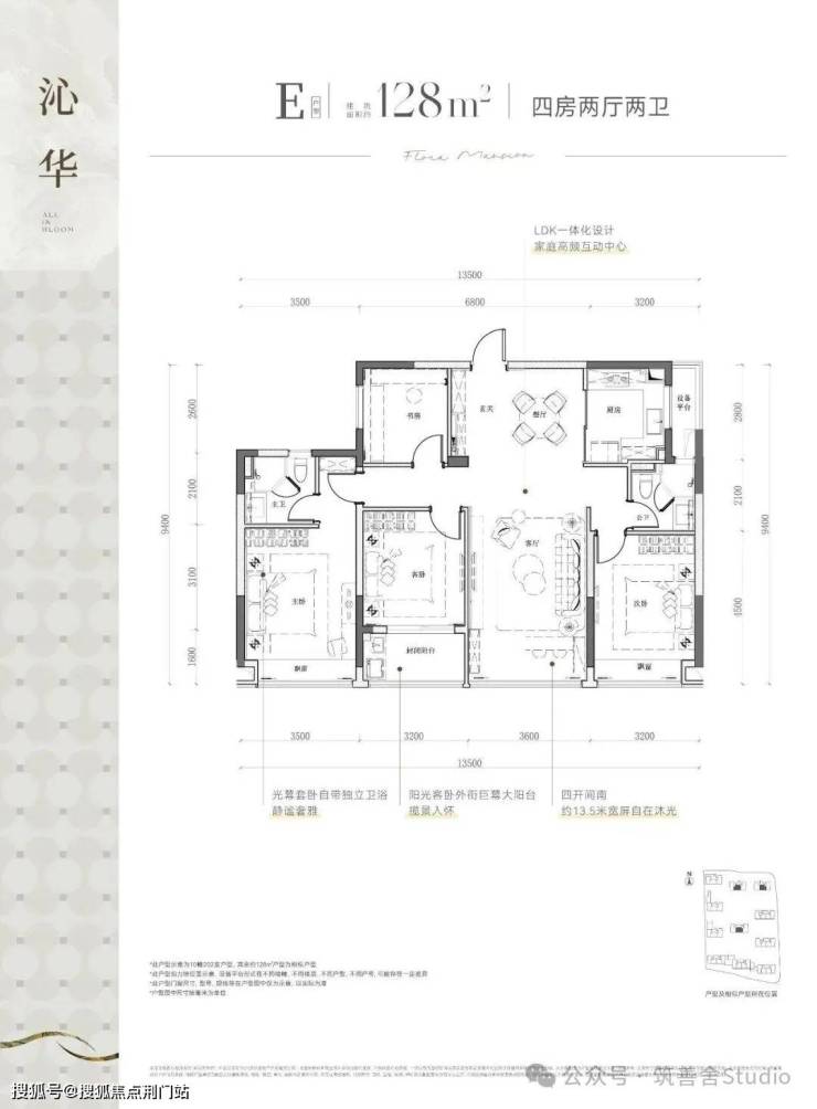 建筑面积约128平方米的四室两厅双卫户型,设计巧妙,四开间均朝南,配备私密式阳台,享受充足的南向自然光照,营造出开阔而明亮的居住空间。