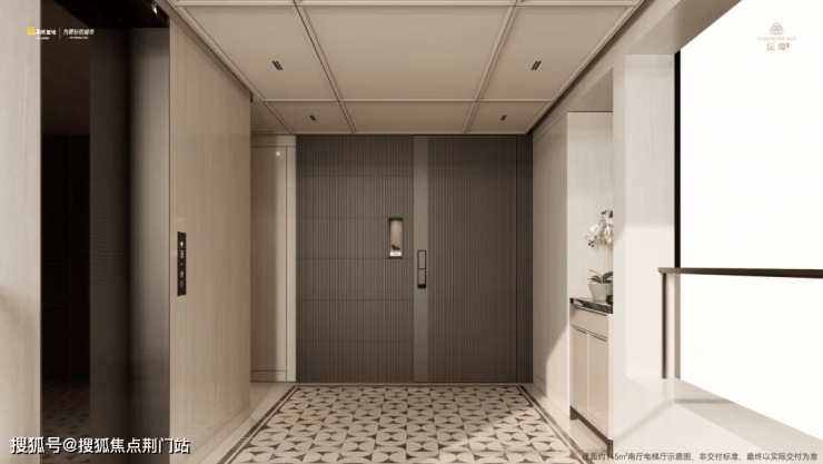 地面是入户大堂同款定制拼花,大门做了同材质的隐框,看起来更大气。门牌号陈列在专属的玻璃壁龛中,室外的玄关柜也是交付标准,甚至还配备了亚马逊绿奢石台面。